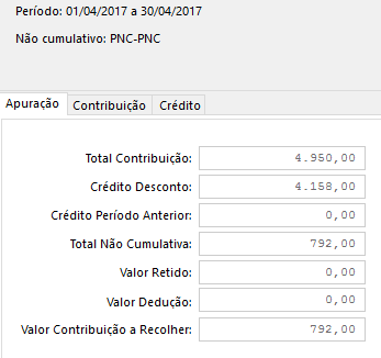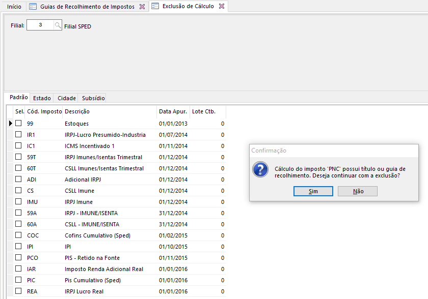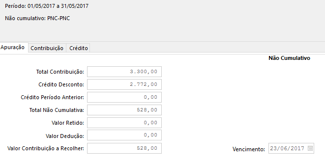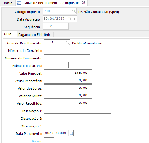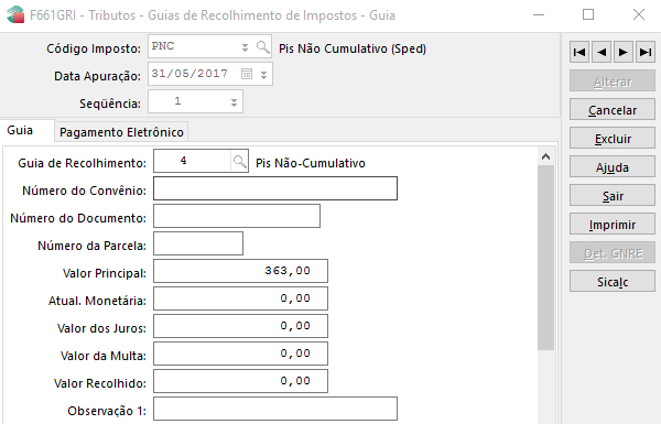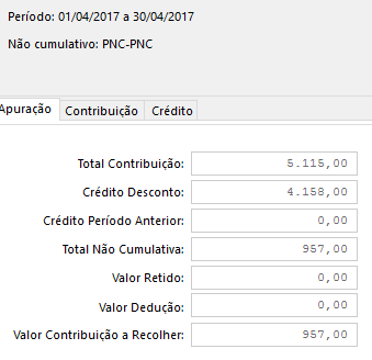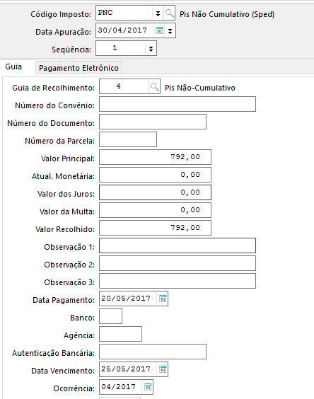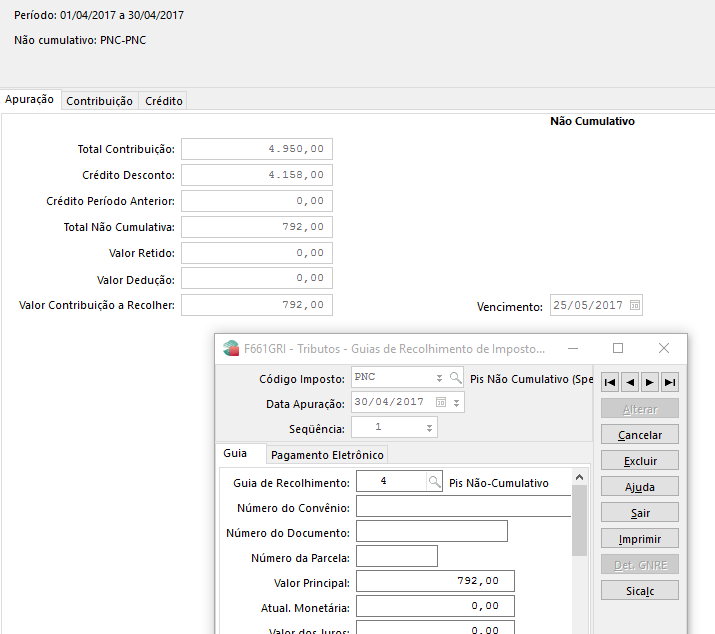 Imposto utilizado no exemplo abaixo foi o PIS (Tipo 41), mas esse recurso pode ser utilizado para os impostos dos tipos: 17, 22, 23, 24, 25, 41, 42, 43, 44, 47, 48, 53, 54, 55, 56, 57, 58, 59, 60, 61.