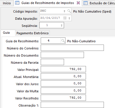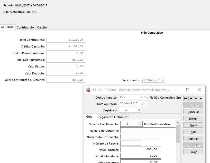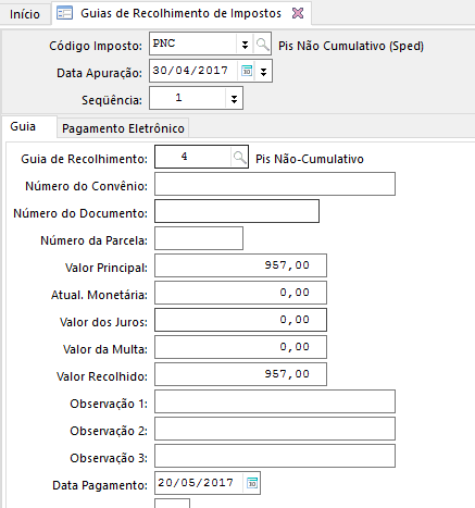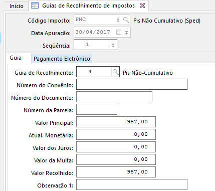 No momento de processar a apuração do imposto, o sistema verificará que para esse período já existe uma guia de recolhimento no valor de R$ 957,00 que já foi paga para esse imposto.
