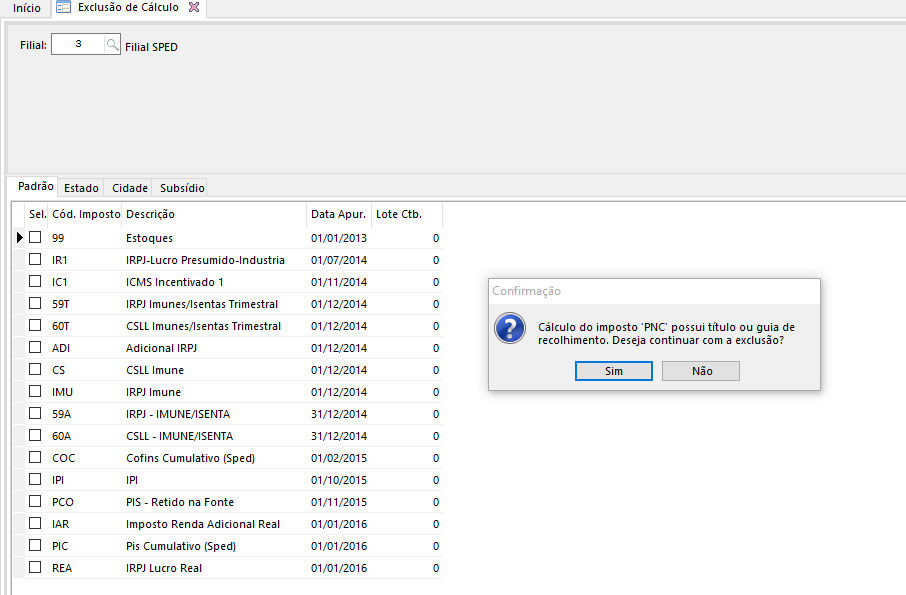 Imposto utilizado no exemplo foi o PIS (Tipo 41), mas esse recurso pode ser utilizado para os impostos dos tipos: 17, 22, 23, 24, 25, 41, 42, 43, 44, 47, 48, 53, 54, 55, 56, 57, 58, 59, 60, 61.