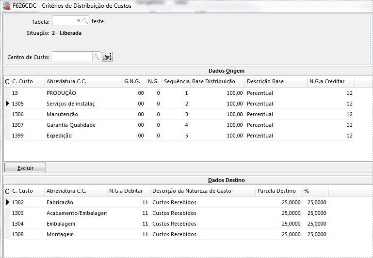 O percentual de distribuição sugerido pelo sistema, que cada centro de custo direto absorve dos centros de custos indiretos, é calculado com base na quantidade de centros de custos diretos obtidos, sempre dividindo igualmente entre cada um até chegar a 100%. Caso seja necessário utilizar algum outro critério, é necessário optar pelo tipo de processamento manual, assim será possível alterar na tela de Critérios de Distribuição de Custos (F626CDC).