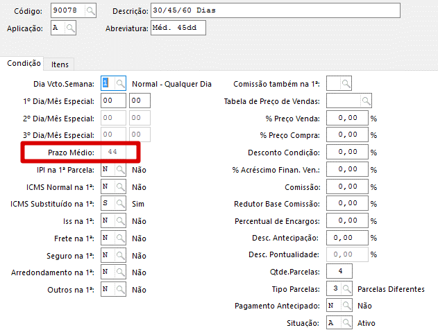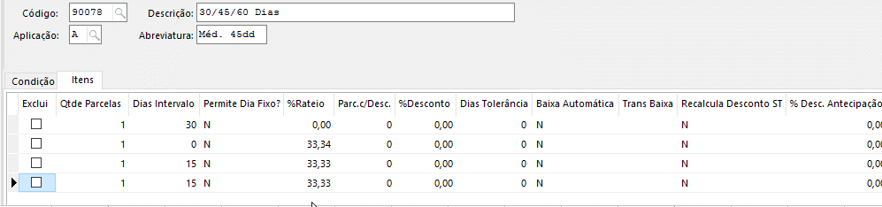 - Com uma parcela, cadastre uma condição de pagamento com os seguintes parâmetros:
