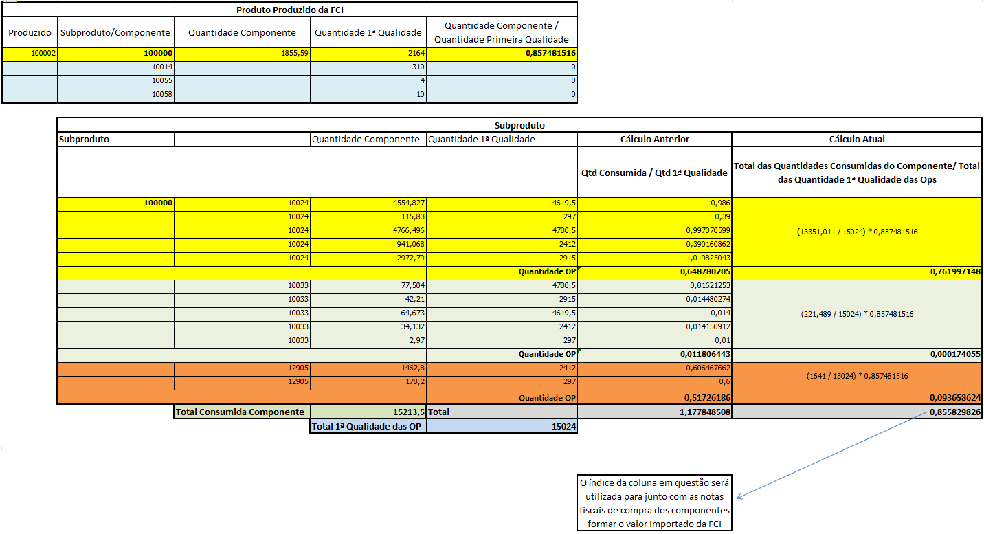 Os componentes localizados das baixas de OPs no período serão considerados até o nível de localizar todos os comprados, com isso, a localização das notas fiscais de compra no período, com mercadorias importadas, ocorrerá como o processo anterior, porém para cada componente comprado, e agrupando todas as informações pela média. Este valor deve ser somado conforme a sua ficha técnica para a construção de 1 unidade do produto produzido.