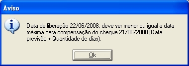 Define a quantidade máxima de dias entre a data de previsão de pagamento e a data de liberação do cheque. No momento da criação do usuário, este campo terá valor 0 (zero) e deverá ser alterado conforme a necessidade.
