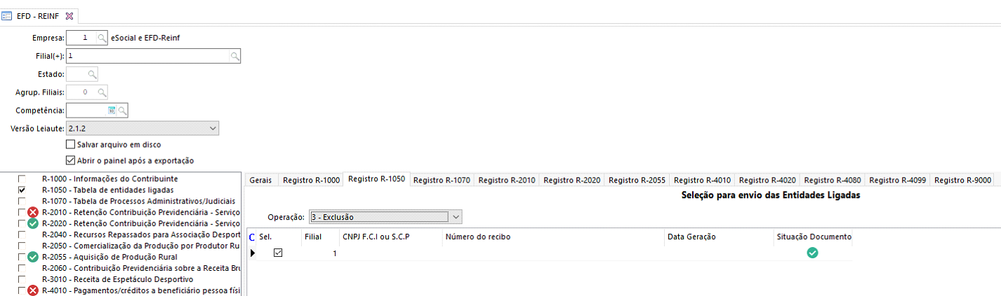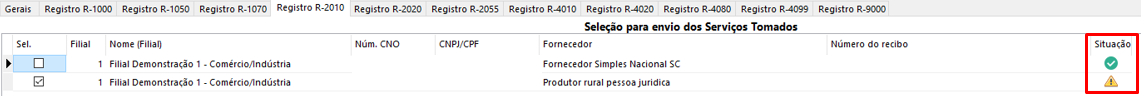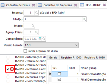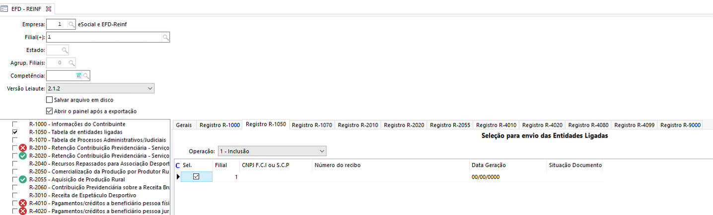 Na guia R-2020, o sistema carrega, de forma agrupada em cada filial, os CNOs ou CNPJs/CPFs dos clientes aptos a serem exportados no período. Para esse cenário, é mostrado na guia R-2020:
