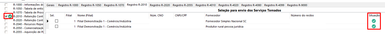 Na guia R-2010, o sistema carrega os CNOs na filial matriz de forma agrupada e, em cada filial, os CNPJs/CPFs dos fornecedores aptos a serem exportados no período. Para esse cenário, é mostrado na guia R-2010: