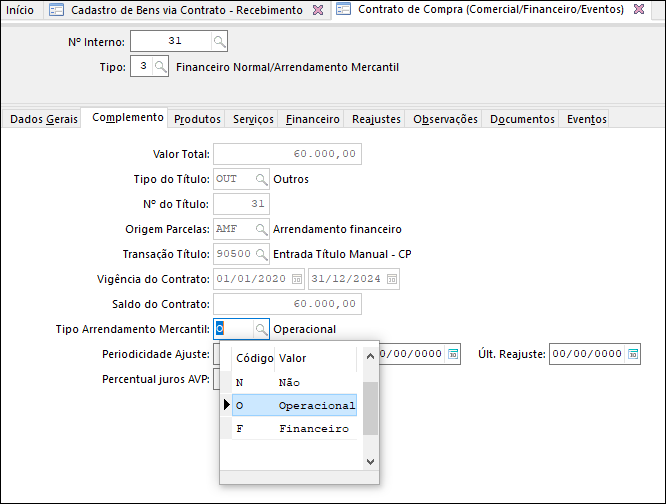 Essa tela permite criar bens por meio de um contrato para a norma IFRS-16. Para isso, é preciso cadastrar o contrato na tela F460CTR com o tipo 3 e tipo de arrendamento mercantil igual a O - Operacional ou F - Financeiro. Ainda no contrato é preciso informar a descrição no campo Objeto. Depois, faça o cadastro da espécie na tela F674ESP.