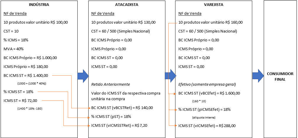 - BC ST retida anteriormente (Por unidade) X Quantidade adquirida X Alíquota interna = Valor do crédito. R$ 140,00 x 10 x 18% = R$ 252,00