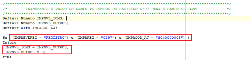 Definir Numero IMPNVL_ICMS; (Campo VL_ICMS) Definir Numero IMPNVL_OUTROS; (Campo VL_OUTROS) Definir Alfa IMPACOD_AJ; (Campo COD_AJ)