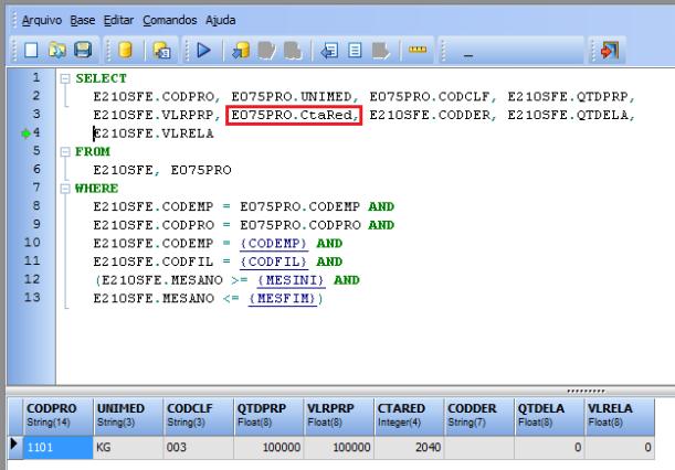Ao alterar um comando padrão, é importante que a nomenclatura dos campos de retorno do SQL padrão seja mantida. Por exemplo: é utilizado o apelido no comando "(AS CTARED)" para que o campo E205DEP.CtaRcr retorne a nomenclatura do comando padrão.