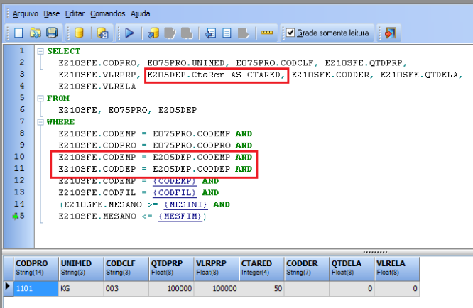 "E210SFE.CODDER, E210SFE.QTDELA, E210SFE.VLRELA "+