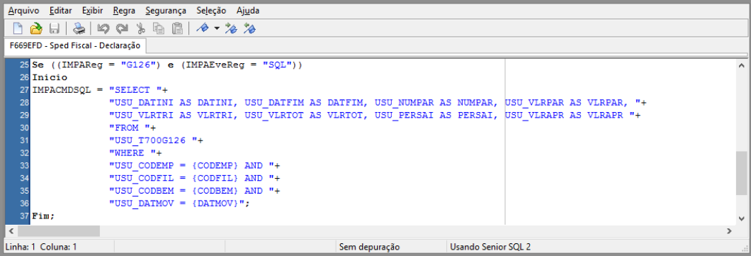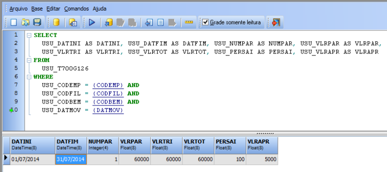 Por exemplo: no registro G126 é necessário retornar, por meio do select, os campos DATINI, DATFIM, NUMPAR, VLRPAR, VLRTRI, VLRTOT, PERSAI e VLRAPR. Para isso, utilize o conceito de apelidos nos campos a seguir: USU_T700ANT.DatBas AS DATINI).