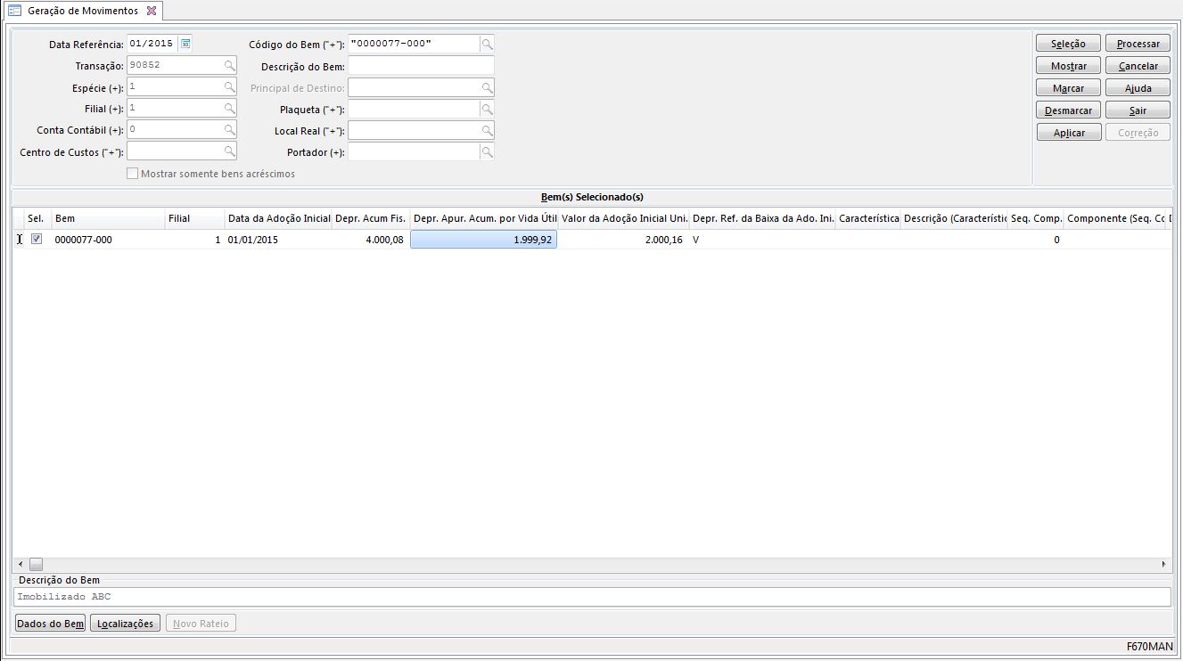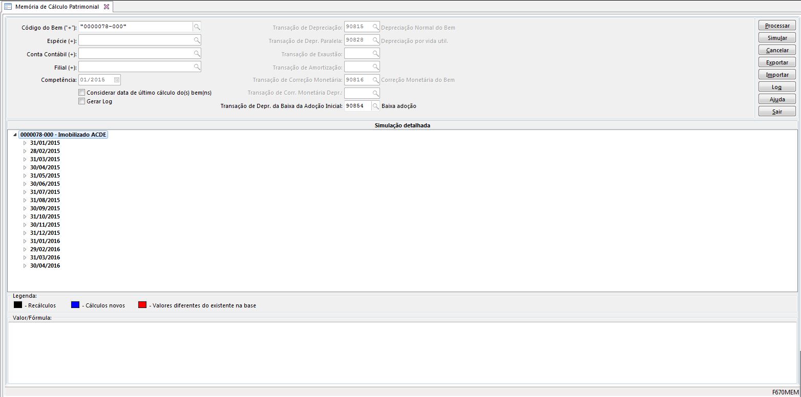 - Acesse a tela Memória de Cálculo Patrimonial (F670MEM);