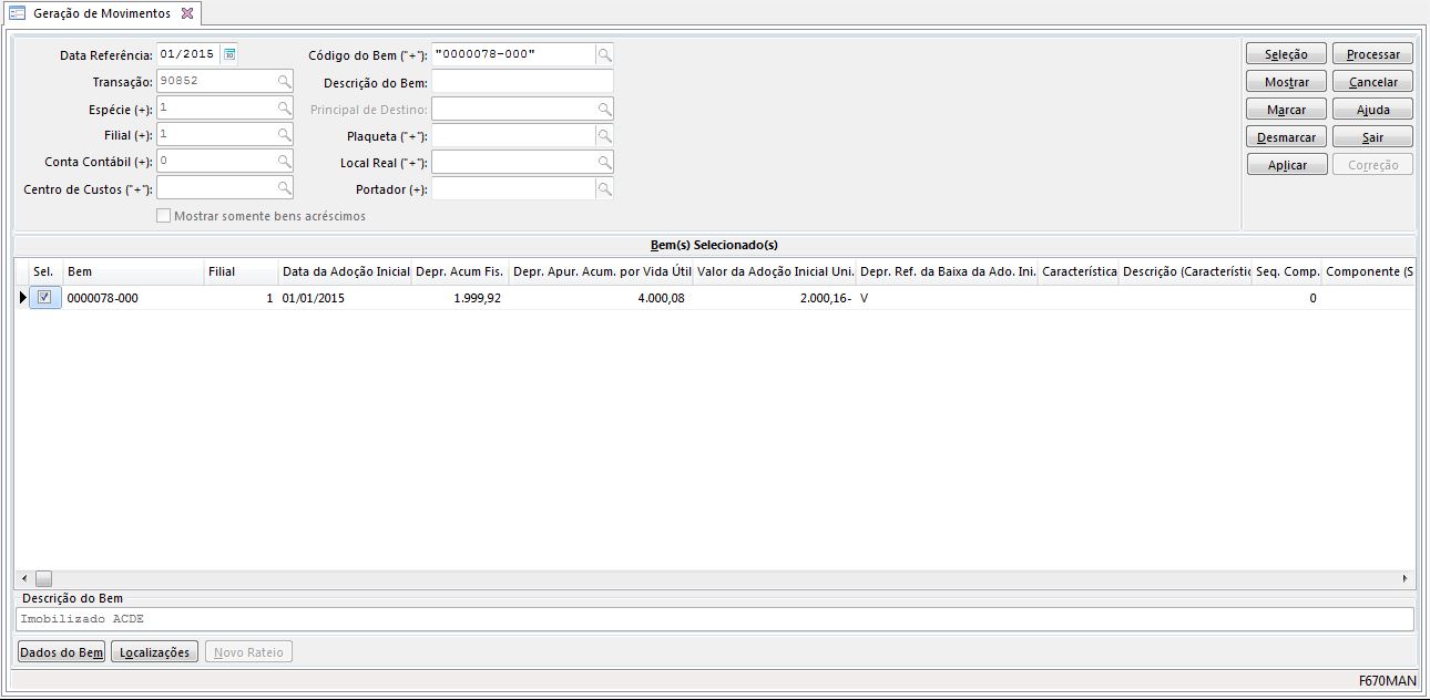 Os campos da adoção inicial do bem são considerados nas movimentações de desdobramento, agrupamento, baixa parcial (valor/percentual), transferência de espécie/conta/centro de custos realizados na tela Geração de Movimentos (F670MAN).