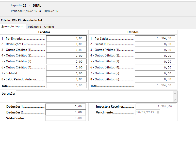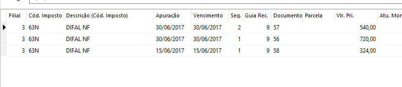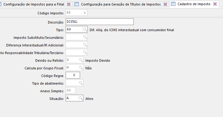 Na configuração do imposto 63 que visa atender a estrutura de apuração do SPED Fiscal, deve-se parametrizar o sistema para que ele gere uma guia de recolhimento e, depois, lançar o título manualmente com a diferença entre o imposto DIFAL total e o imposto DIFAL recolhido nota a nota.