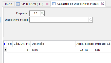 Cadastre um dispositivo fiscal do tipo SPED com o imposto que irá gerar as guias de recolhimento através da nota fiscal e o estado de destino:
