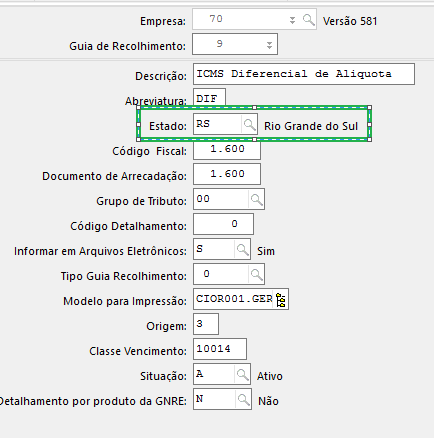 A guia de recolhimento informada no imposto para gerar uma guia através da nota fiscal deve ser do mesmo estado: