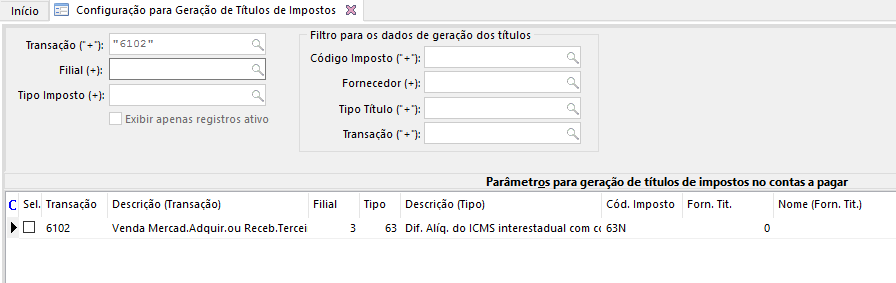 Dessa forma, quando o cliente está gerando um título nota a nota e no meio do mês ele adquire uma inscrição estadual para realizar a apuração mensal, esse cliente precisa, primeiro, desativar a geração do título e guia de recolhimento nota a nota, removendo a configuração vinculada à transação de venda com o imposto 63.