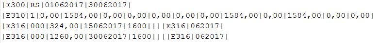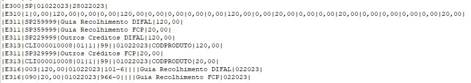 No arquivo, o registro E310 será apresentado com o débito que a empresa deveria pagar, junto com todas as guias de recolhimento comprovando o pagamento. Caso haja mais de uma guia com o mesmo vencimento, ela será agrupada para não ocorrer erro de duplicidade de registro:
