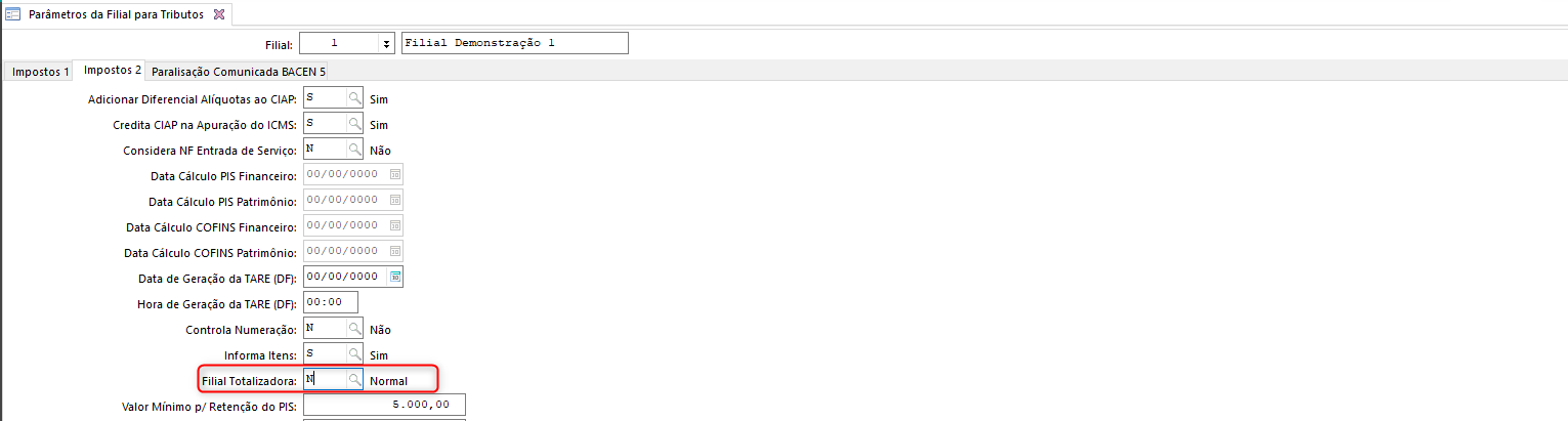 - Nas demais filiais, acesse a tela acima, preencha o campo Filial Totalizadora como "N - Normal" e informe a filial consolidadora em Filial Consolidadora;