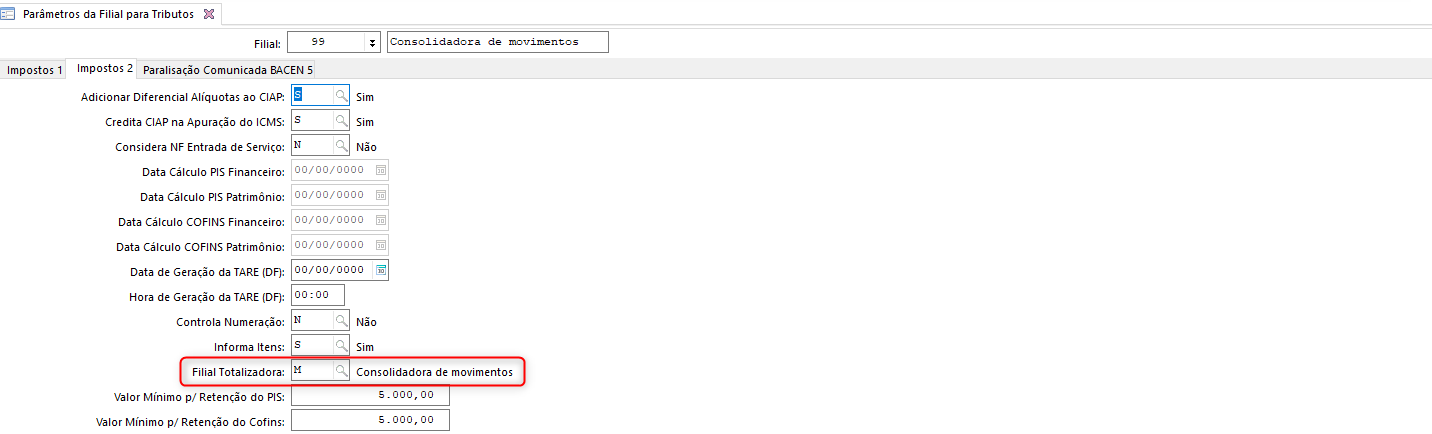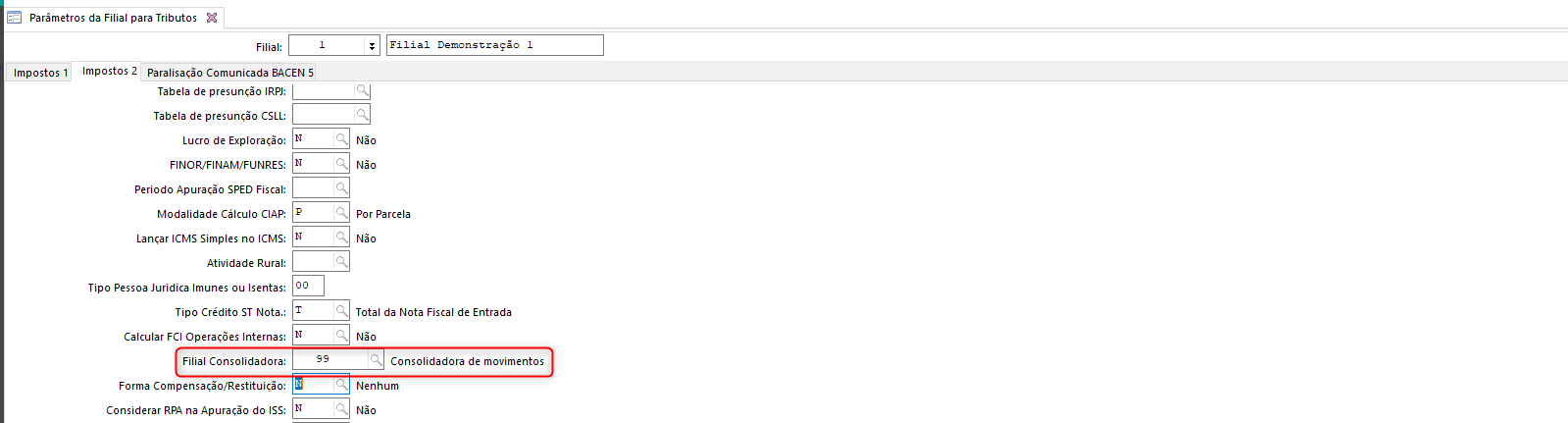 - Na filial criada, acesse a tela Parâmetros da Filial para Tributos (F070FEF) e preencha o campo Filial Totalizadora com "M - Consolidadora de movimentos";