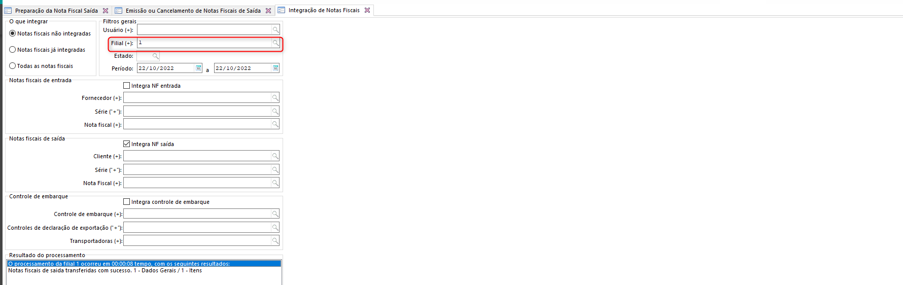 - Acesse a tela Integração de Notas Fiscais (F660INT) e a execute para as demais filiais;