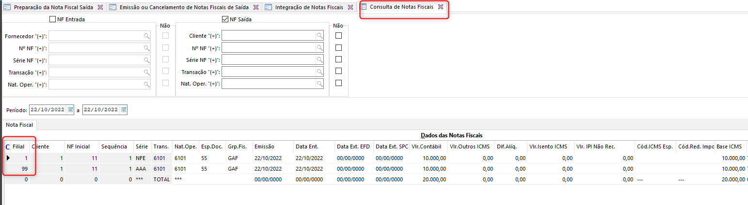 - Acesse a tela Consulta de Notas Fiscais (F660CNF) e veja que o sistema duplica a nota fiscal para a filial consolidadora: