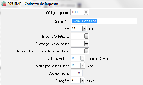 - Criar os impostos do tipo 2-ICMS para a apuração normal (Exemplo: ICM), café conilon (Exemplo: ICO) e café arábica (Exemplo: ICA);