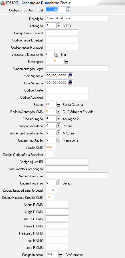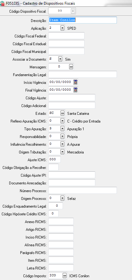 - riar um código de dispositivo fiscal para ser associado ao item da nota fiscal de café Conilon e este dispositivo deve ter a indicação da apuração do imposto para o café conilon (ICO). Criar outro código de dispositivo fiscal para ser associado aos itens da nota fiscal de café Arábica e este dispositivo também deve ter a indicação da apuração do imposto para o café Arábica.