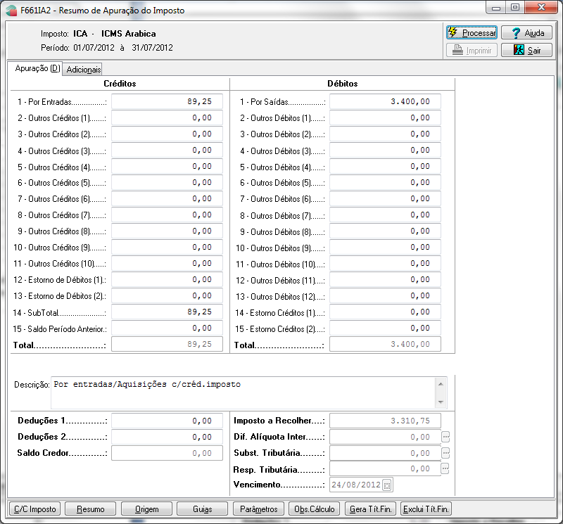 Efetuar a apuração dos impostos ICM, ICA e ICO.