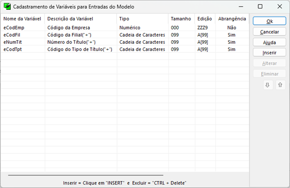 Obs.: Os valores enviados para as variáveis são referente(s) ao(s) título(s) selecionado(s) na grade "Títulos a Baixar (1)", dessa tela.