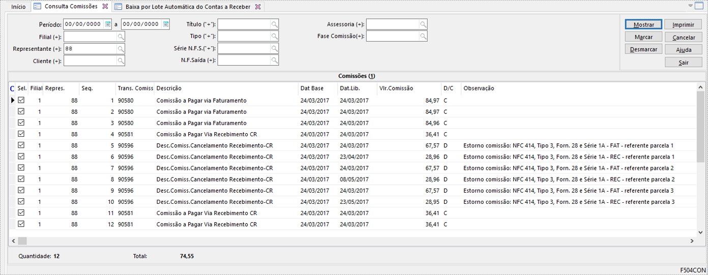 Esta tela tem como objetivo consultar os movimentos das comissões geradas para representantes e assessorias de cobrança.