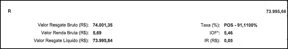 O valor do resgate, tanto na conta interna quanto na conta aplicação, será de R$ 73.995,84 (73.995,66 + 5,69 - 5,46 - 0,05).
