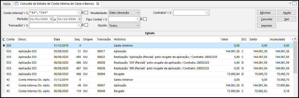 Quando houver um contrato de aplicação com quantidade de cotas informada e um item tipo "D - Índice" no cálculo do contrato ou o contrato for do tipo "Fundo de Investimento", após pressionar o botão Mostrar serão exibidos os campos Qtd. Cotas Disponíveis e Qtd. Cotas Resgate.