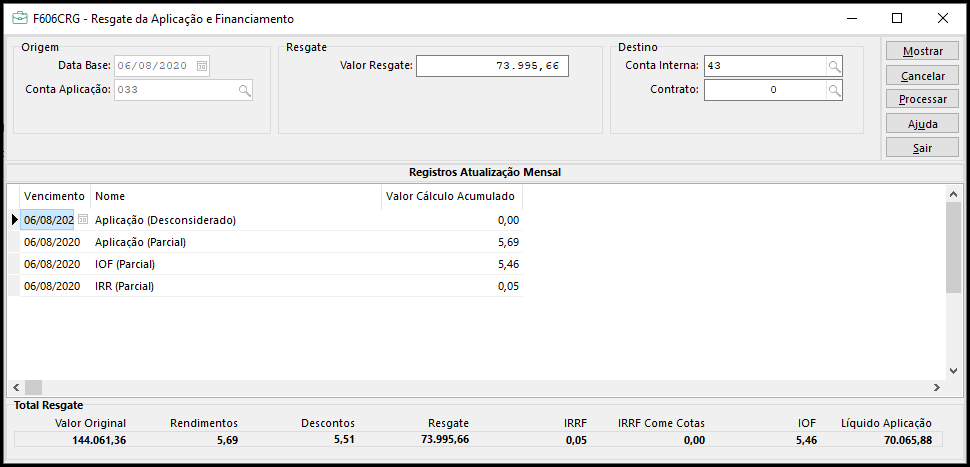 Ao informar um valor de resgate parcial, será adicionada uma nova linha na grade Registros Atualização Mensal com o valor do rendimento parcial, as linhas dos tributos (IR e IOF) terão seus valores atualizados com o parcial.