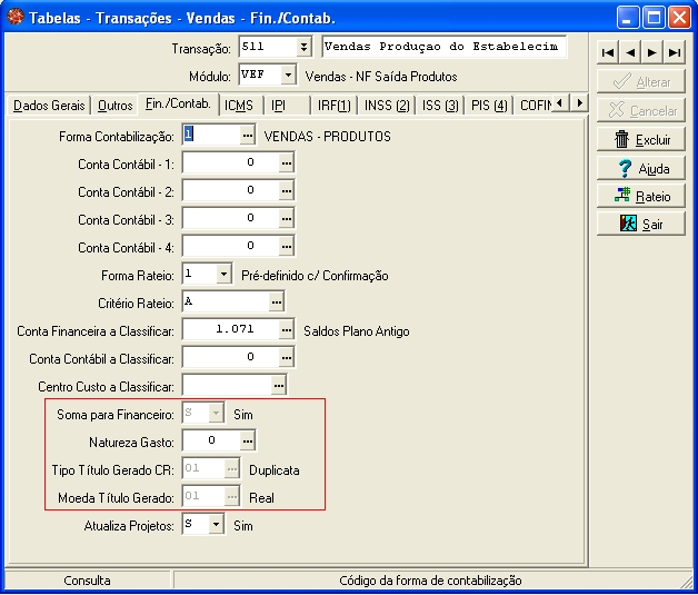 | Soma para Financeiro | Parametrização efetuada através do campo Soma para Financeiro, localizado na guia "Fin./Contab." da tela F001TVE. | Este campo deve ser preenchido com o valor