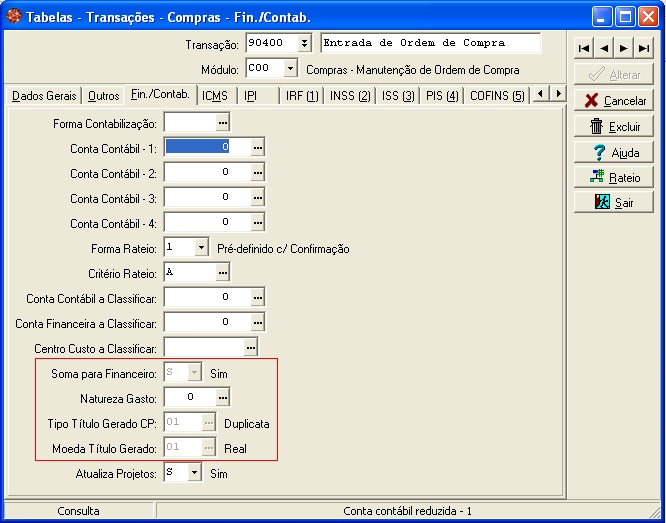Este campo deve ser preenchido com o valor "S"(Sim). A transação cadastrada dessa forma poderá gerar título no financeiro quando utilizada numa ordem de compra. Importante