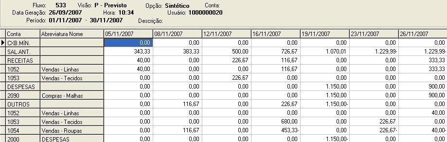 Fluxo de caixa projetado para o mês de novembro a partir do meses de agosto/2007, setembro/2007 e outubro/2007. Ou seja, a partir de um cenário já existente, projetou-se um cenário para o mês de novembro/2007, utilizando a visão "Previsto".