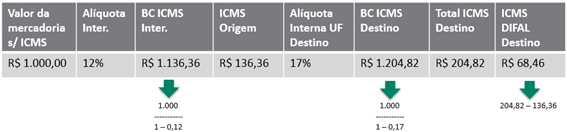 O ICMS é um imposto calculado por dentro, ou seja, considera-se que o seu valor já está embutido no preço final da mercadoria/serviço. Sendo assim, no exemplo acima o valor de R$ 2.000,00 está considerando 18% de ICMS e esse valor é referente ao ICMS total da operação. Na UF de origem o ICMS é 12%, então o valor da base de cálculo será menor. Para se chegar ao valor da base é necessário subtrair o valor do ICMS total e aplicar o percentual do ICMS na origem por dentro: