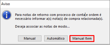 Ao processar o fechamento da nota fiscal de retorno de industrialização (tipo 4) pela tela Nota Fiscal de Entrada Agrupada (F440GNE), será apresentada uma mensagem avisando que a transação de compra do produto faz parte de um processo de conta e ordem. Deve-se escolher a opção Manual Item.