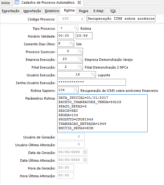 As notas fiscais de entrada são geradas por um processo que deve ser agendado para ser executado (104 - Recuperação de ICMS sobre acréscimo financeiro). A rotina avalia as vendas realizadas via cupom fiscal, NFC-e, SAT e notas eletrônicas e calcula o valor passível de recuperação de ICMS, lançando uma ou mais notas fiscais de entrada para acerto (nota do tipo 10 no ERP). As notas fiscais de entrada são geradas contendo um produto que deve ser cadastrado previamente no sistema. A fim de atender aos requisitos da SEFAZ, um produto fictício deverá ser cadastrado com código "CFOP1949" e deverá também utilizar uma classificação fiscal em que o código NSU (campo Classificação fiscal da tela F022CLF) deste produto seja "00000000".