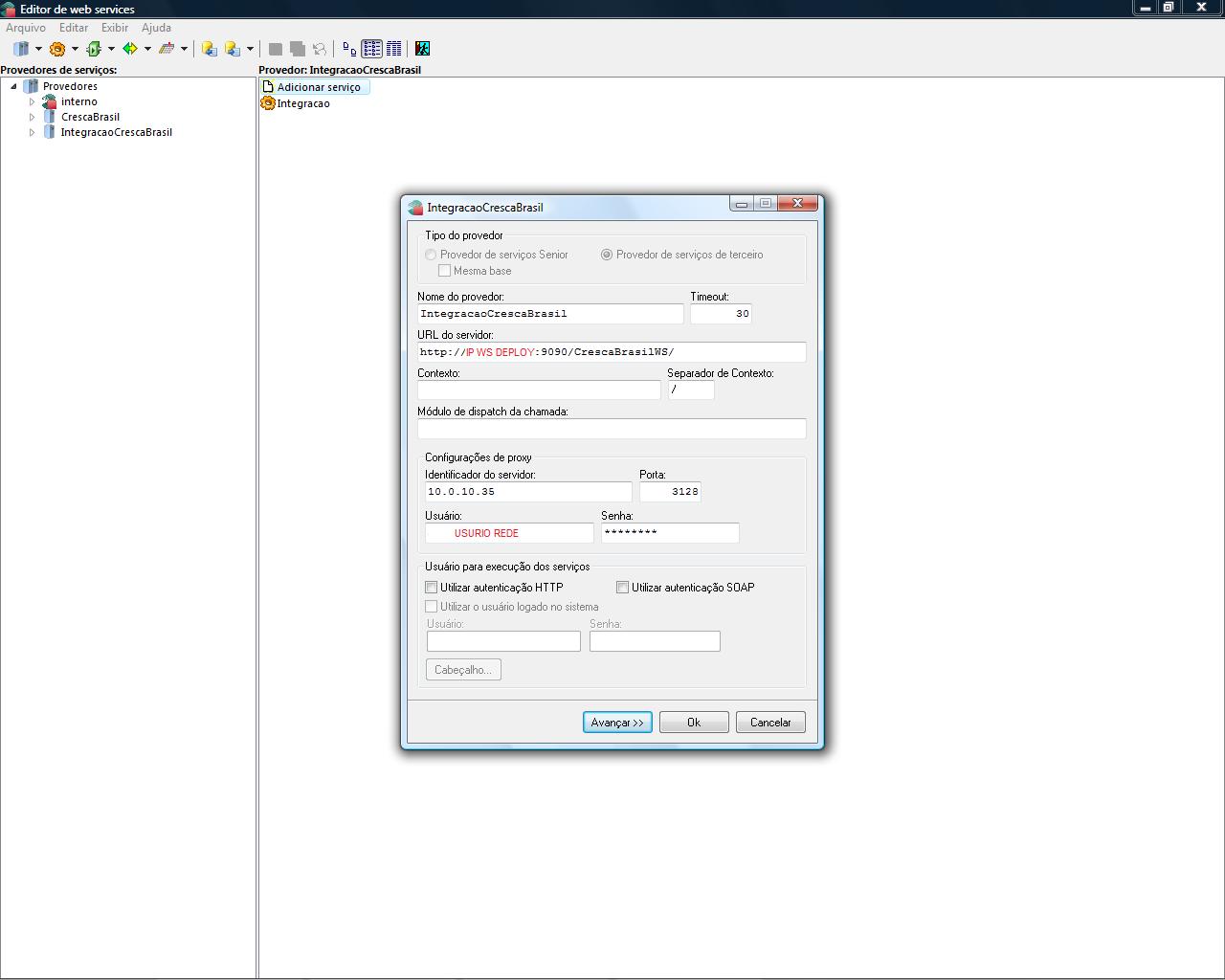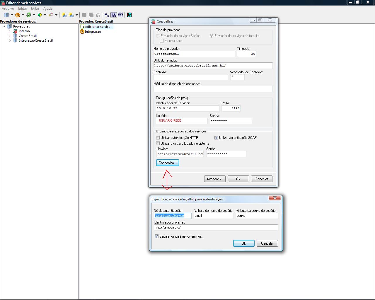Abaixo as imagens mostram passo a passo como configurar os provedores CrescaBrasil e IntegracaoCrescaBrasil: