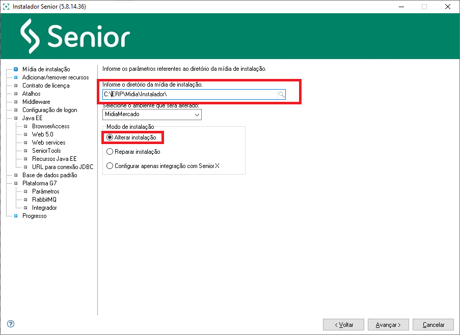 - Informe, no diretório de mídia, a mídia da versão utilizada no ambiente. Depois, em Modo de instalação, selecione Alterar instalação e clique em Avançar: