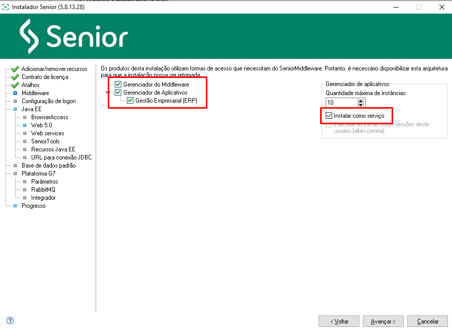 - Marque as opções Gerenciador do Middleware, Gerenciador de Aplicativos e Gestão Empresarial (ERP). Depois, marque a opção Instalar como serviço e clique em Avançar: