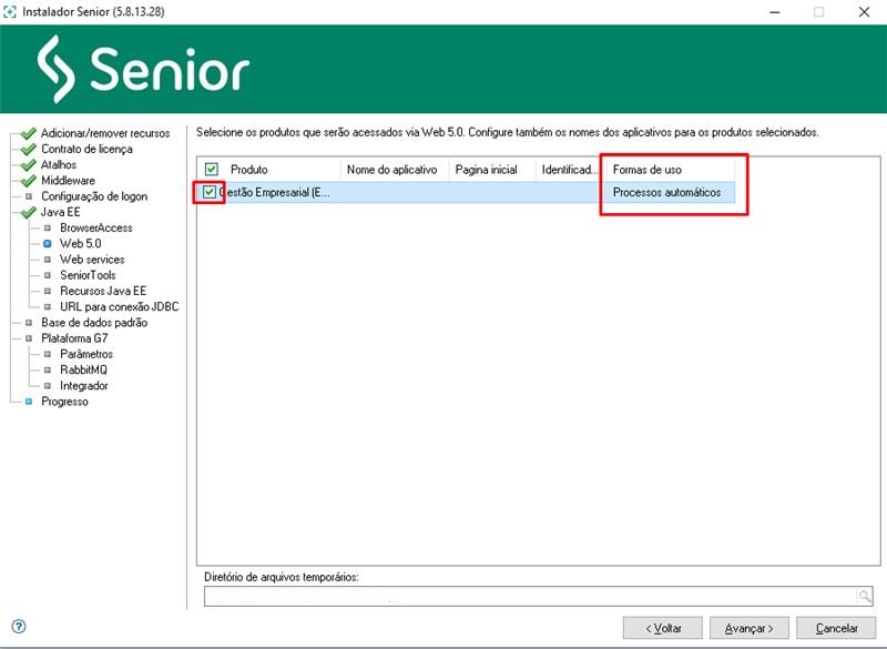 - Para clientes GO UP: deixe marcada apenas a opção com a Forma de uso igual a Processos automáticos (mesmo havendo outras). Depois, clique em Avançar: