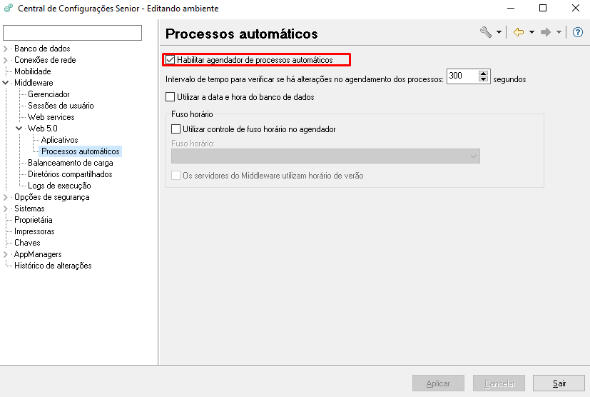 - No SeniorConfigCenter, acesse o menu Middleware > Web 5.0 > Processos automáticos e marque a opção Habilitar agendador de processos automáticos: