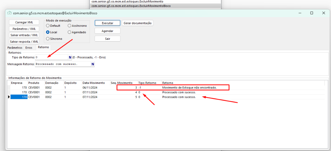 No "Processamento em Bloco", ao enviar dados de uma movimentação que não esteja registrada no ERP, o sistema mostrará na linha correspondente a mensagem de "Movimento de Estoque não localizado" e os movimentos localizados serão excluídos, ou seja, apenas retornará erro na chamada do WS caso ocorra um erro ao excluir o movimento. Confira a imagem de exemplo da situação abaixo: