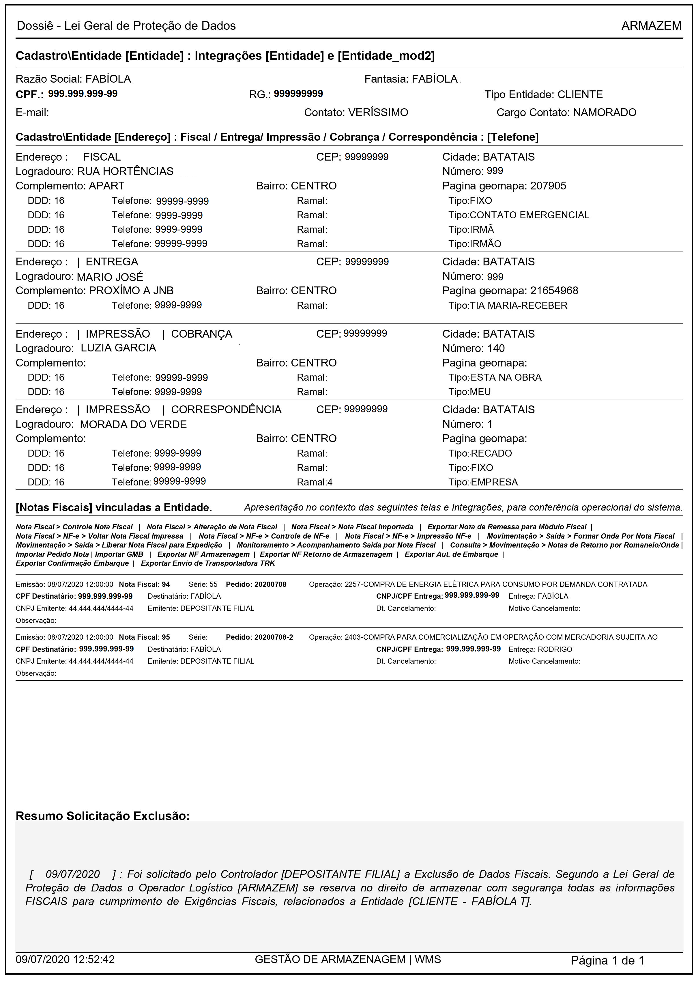 Este dossiê é Dossiê da Entidade que pode ser solicitado a qualquer momento e apresenta somente informações que fazem parte do mapeamento da LGPD.