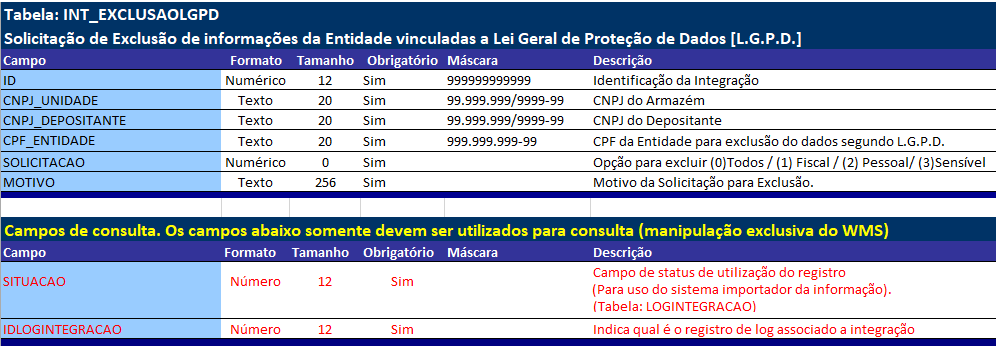 Tabela INT_EXCLUSAOLGPD:
