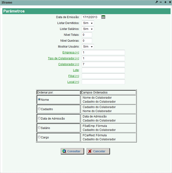 - params=: encaminha os parâmetros para o relatório. Exemplo: emp, tip, col = 1,1,127.