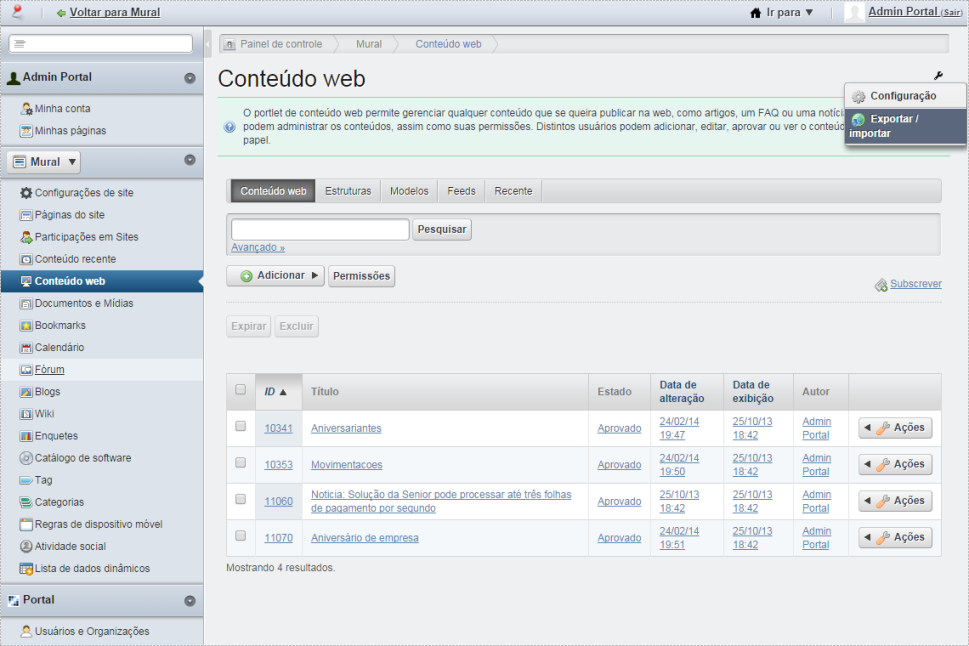 Para disponibilizar um site no menu superior do Portal Corporativo, e necessário disponibilizar páginas nele. Para isto, acesse Painel de Controle > Portal > Sites: